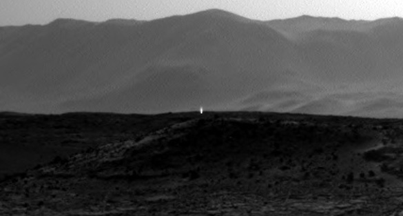 An artificial light source was seen this week in this NASA photo which shows light shining upward from…the ground. This could indicate there there (sic) is intelligent life below the ground and uses light as we do. This is not a glare from the sun, nor is it an artifact of the photo process. Look closely at the bottom of the light. It has a very flat surface giving us 100% indiction (sic) it is from the surface. Sure NASA could go and investigate it, but hey, they are not on Mars to discovery life, but there to stall its discovery.