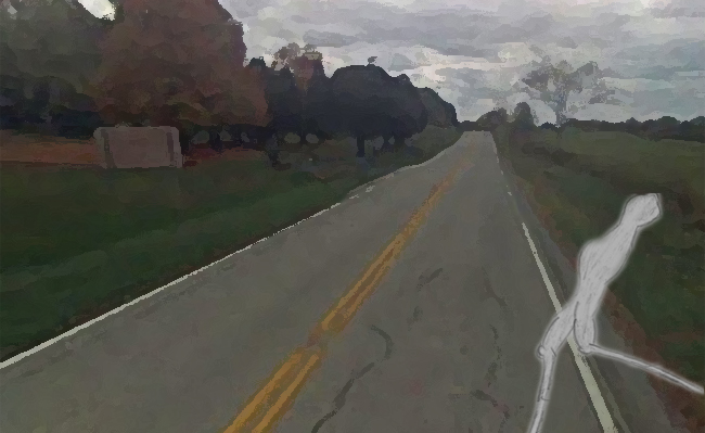 My husband saw it. He is a skeptic – almost 60 years old – and a proud Marine. He wouldn’t have admitted to seeing it if he hadn’t been in shock. I had him draw it for me when we got to the house. He says it was asphalt gray (our asphalt is gray) and about 7 feet tall, no arms that he could see, but muscular in the legs area; no jawline, and its legs were bent backward and it leaned forward as it ran.