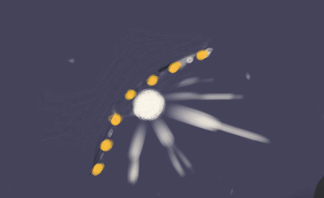 In the middle of the reign of Emperor Jia You [1056-1064], at Yangzhou in the Jiangsu province, an enormous pearl was seen especially in gloomy weather. At first it appeared in the marsh of the Tianchang [or Tienzhang] district, passed by the lake of Bishe and disappeared finally in the Xinhai lake. The inhabitants of that region and travelers saw it frequently over a period of ten years. I have a friend who lives on the edge of the lake. One evening, he looked through the window and saw the luminous pearl near his house. He half-opened his door and the light entered, illuminating the room with its brightness. The pearl was round, with a gold-colored ring around it. Suddenly, it enlarged considerably and became bigger than a table. In its centre, the luminary was white and silvery, and the intensity was such that it could not be looked at straight on. The light it emitted even reached trees that were some 5 kilometers away and as a result these cast their shadow on the ground, the faraway sky was all alight. Finally, the round luminous object began to move at a breathtaking speed and landed on the water between the waves, like a rising sun.