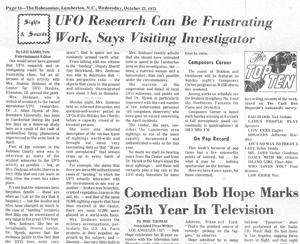 Researchers working with CUFOS, including investigator Jennie Zeidman, compiled witness interviews, timelines, maps, and news coverage into what became known as The Lumberton Report.