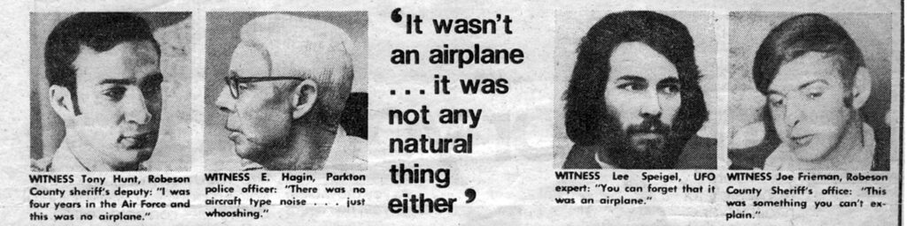 Accompanied by a reporter from the National Star, Speigel traveled to North Carolina to investigate the reports personally. Flying into Fayetteville, about forty miles north of Lumberton, he looked down at the landscape where the sightings had been occurring.