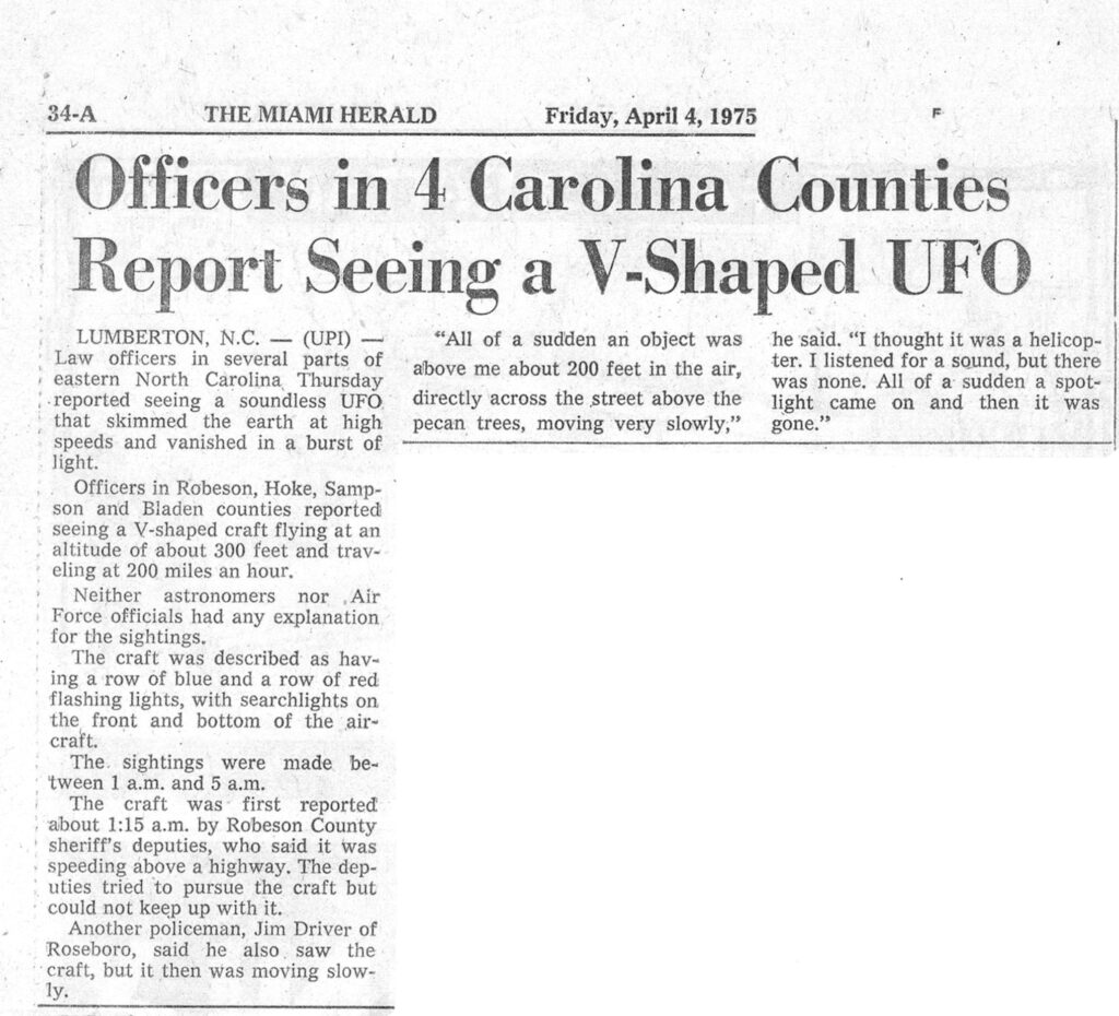 The 1975 Lumberton UFO Wave: Police Across North Carolina Report a Silent V-Shaped Craft