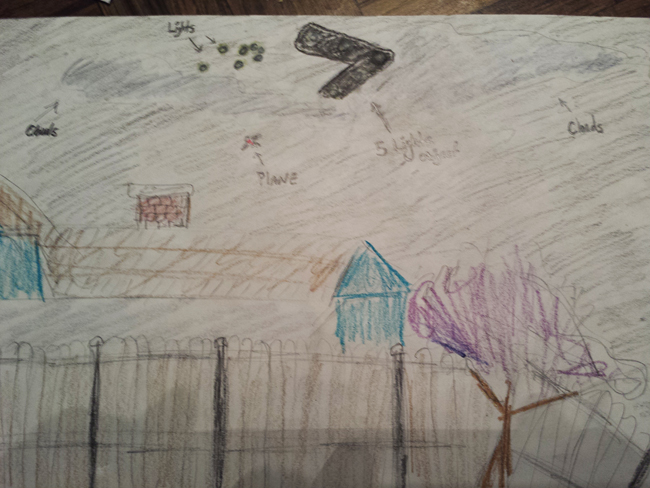 “The lights were dim, but put off a haze or a slight glow. It was fast and there was a plane just below the object as it passed. Please don’t get me wrong – this object was nowhere near the plane and traveled at a much, much faster pace. Man, the V-shape was jaw dropping when I could make out the full object. I couldn’t make out what the other lights were, but just lights traveling at the same pace not far behind. It seemed to be traveling west to north spotting in the northwest at about 45 degrees of the horizon.”